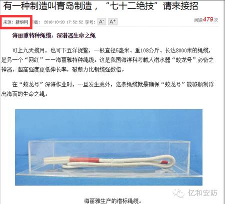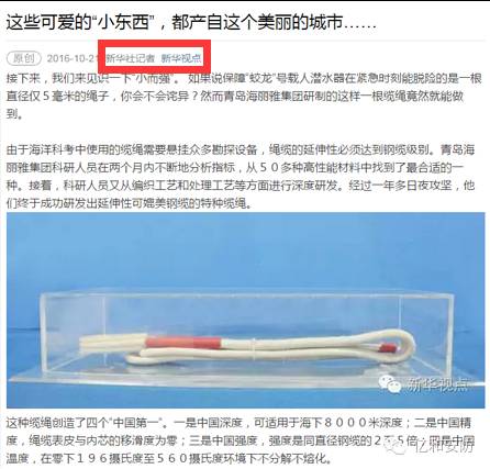 2016年10月20日新華社在《有一種制造叫青島制造,“七十二絕技”請來接招》中報道“海麗雅特種繩纜:深潛器生命之繩”。