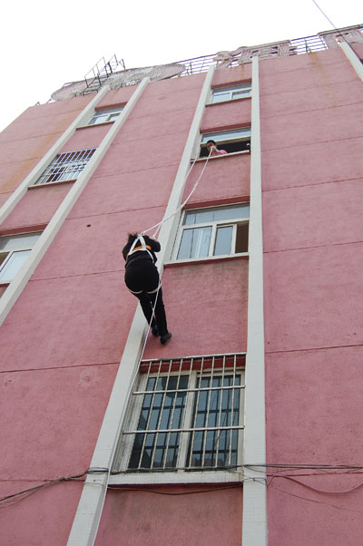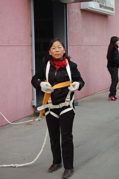 2010年11月19日下午,青島億和海麗高強力安全防護(hù)用品有限公司開展了高空火災(zāi)防護(hù)自救互救演習(xí)。57歲的梁子蘭率先從高空使用救生緩降器安全下落到地面,并給大家現(xiàn)場講解使用方法,活動吸引了大批市民參與并現(xiàn)場觀摩。