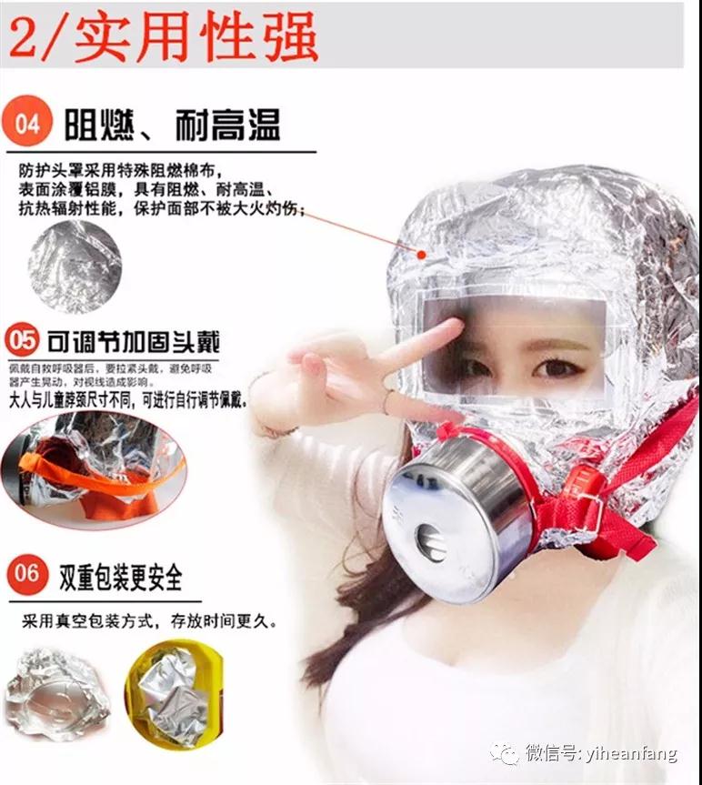 發(fā)生火災(zāi)時,佩戴“海麗安心”過濾式消防自救呼吸器,可通過過濾裝置吸附、吸收、催化及直接過濾去除一氧化碳、煙霧等有害氣體,保證人員的生命安全。