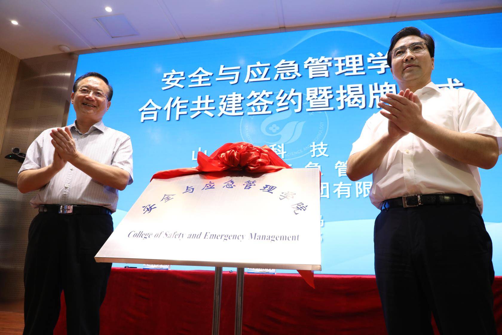 山東科技大學(xué)黨委書記羅公利(左)、青島市政府副秘書長萬建忠(右)為“安全與應(yīng)急管理學(xué)院”揭牌