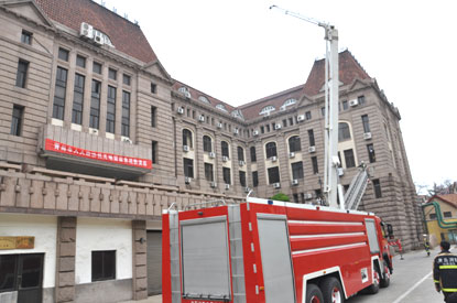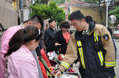 演練共分四個科目:一是緊急疏散演練,在聽到指揮人員發(fā)出疏散指令后,全體辦公人員按預定疏散路線迅速撤離到辦公樓院內指定區(qū)域;二是應急救護演練,在全體辦公人員疏散到指定區(qū)域后,市紅十字會、市120急救中心組織應急救援志愿者,滯留在大樓中的受傷人員進行救援撤離和現(xiàn)場救護;三是消防云梯救人和滅火演練,市公安消防局接到求救電話后,迅速派出消防車趕赴現(xiàn)場進行救人、滅火;四是窗口逃生演練,由于辦公樓樓梯損壞,工作人員利用緩降器由窗口逃生。