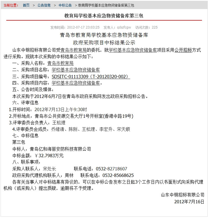 青島市教育局學(xué)校基本應(yīng)急物資儲(chǔ)備庫(kù)政府采購(gòu)項(xiàng)目