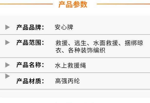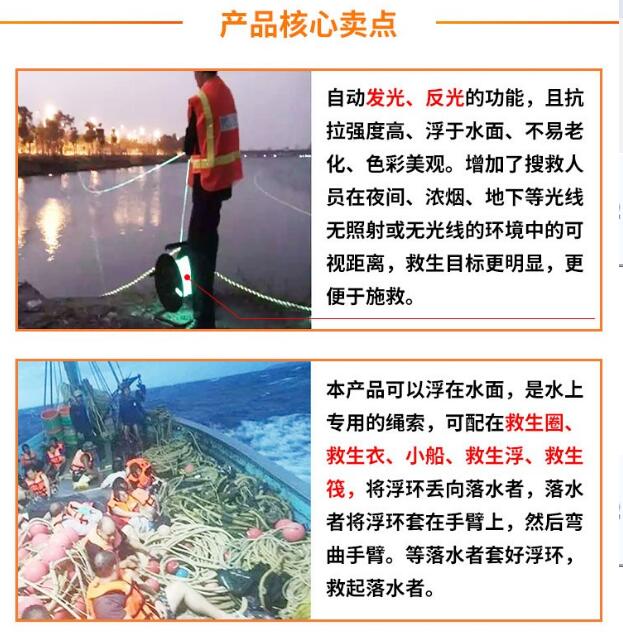 安心牌洪水救援時繩索抗拉強(qiáng)度高、漂浮于水面、不易老化、色彩美觀。增加了搜救人員在夜間、濃煙、地下等光線無照射或者無光線的環(huán)境中的可視距離,救生目標(biāo)更明顯,更便于施救。