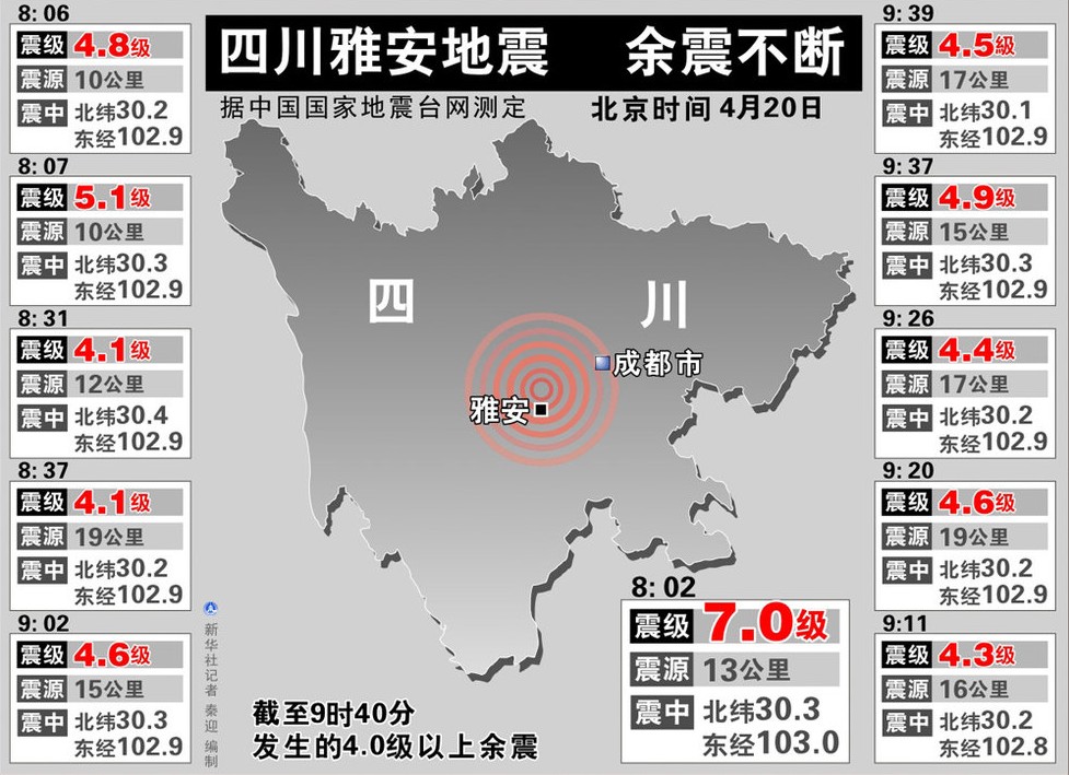 此外,經(jīng)過國(guó)家電網(wǎng)德陽(yáng)電業(yè)局15名電力搶險(xiǎn)人員2小時(shí)的搶修,蘆山縣黎明水廠13時(shí)恢復(fù)供水。該水廠檢驗(yàn)員吳江說,這是震后首個(gè)恢復(fù)的水廠,可滿足城區(qū)10余萬(wàn)人的應(yīng)急用水需求。