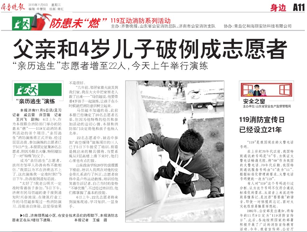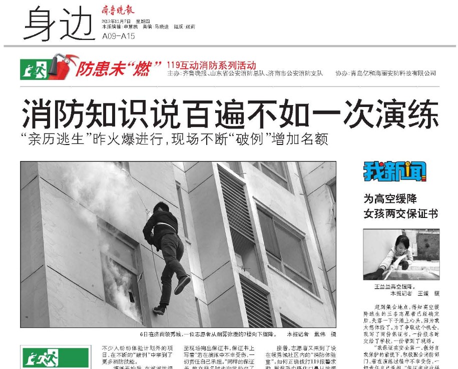 此次消防演練中,青島億和海麗安防科技有限公司模擬了一棟高層住宅突然起火,高樓層居民通過高空緩降器或多層樓宇逃生繩進(jìn)行逃生。并邀請了20名市民,參加了高層火災(zāi)逃生消防演練。