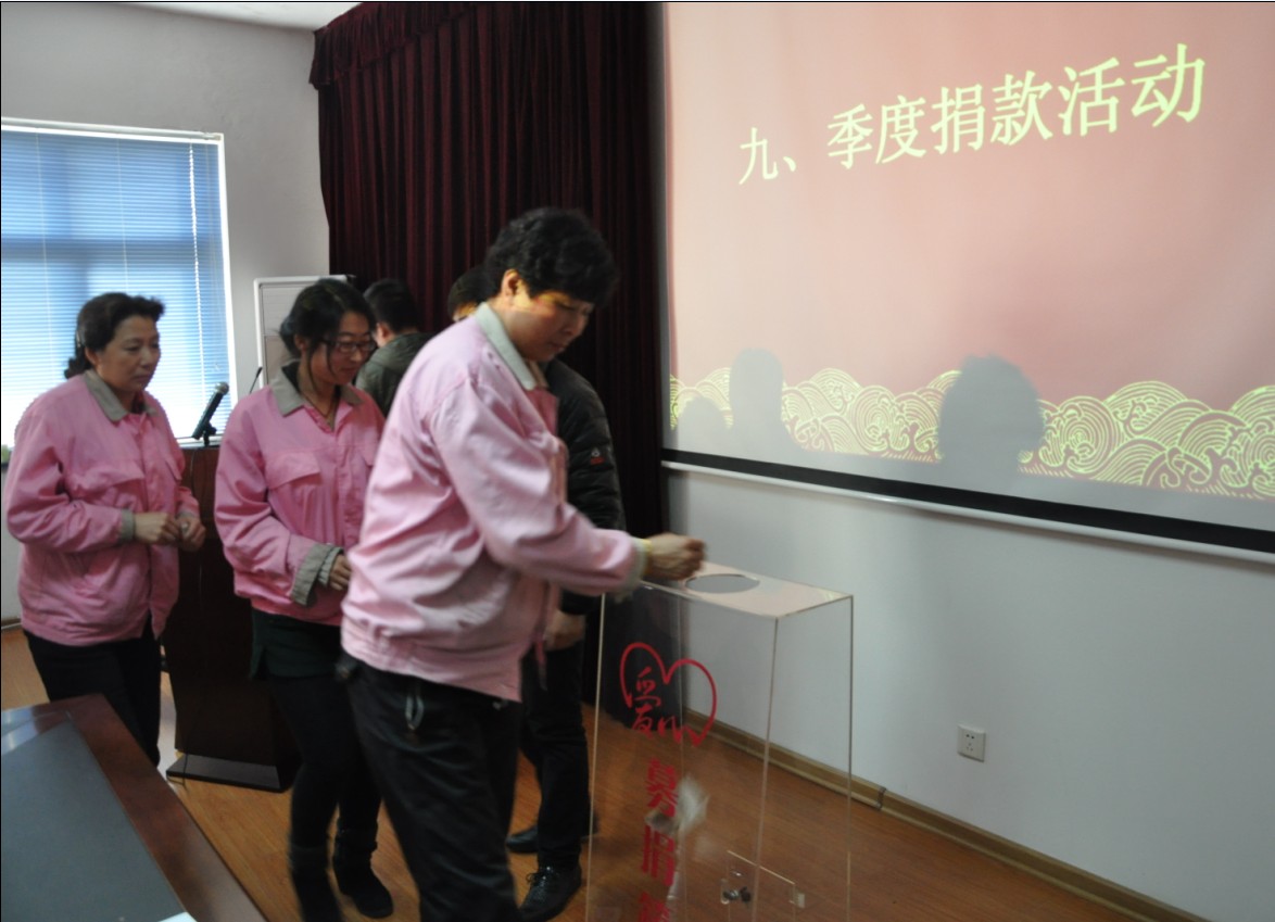 會(huì)中,全體培訓(xùn)人員通過(guò)朗誦《海麗公司八榮八恥》、合唱《海麗之歌》、觀看公司宣傳片,以及愛心基金會(huì)季度捐款活動(dòng),受到了海麗濃厚文化的潛移默化影響,更增加了對(duì)企業(yè)的熱愛之情。