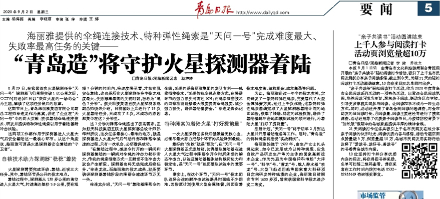 按照計(jì)劃,“天問一號(hào)”將于明年2月到達(dá)火星并開展著陸準(zhǔn)備等工作。屆時(shí),“青島造”的特種繩索將接受“實(shí)戰(zhàn)測(cè)試”。