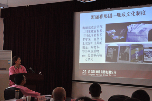 會議在《海麗雅八榮八恥》誓言中正式開始,隨后全體參會人員飽含真情共唱《海麗雅之歌》。歌聲結(jié)束,億和海麗公司常務(wù)副總經(jīng)理楊光對大家進行《銷售自己》培訓(xùn),與大家共同分享自己多年的營銷經(jīng)驗、傳授營銷技能,博得陣陣掌聲。會上,集團黨支部書記、副總經(jīng)理崔俊芬就《廉潔自律文化建設(shè)》進行培訓(xùn),廉潔建設(shè)伴隨海麗集團的成立已有近百年的歷史,工作中大家廉潔自律,收到客戶送來的禮品、禮金及時足額上交的氛圍濃厚,在公司董事長的帶領(lǐng)下,發(fā)揚廉潔風(fēng)氣,讓“廉潔做事、廉潔做人”在每一個參加培訓(xùn)人心里生根發(fā)芽。