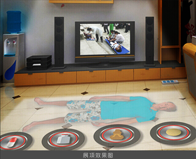 家居消防安全設(shè)備展示方式:通過地面投射的方式,展示一個不同程度燒傷的傷員,參觀者通過選擇不同的處理辦法,進(jìn)行傷員的虛擬救助。