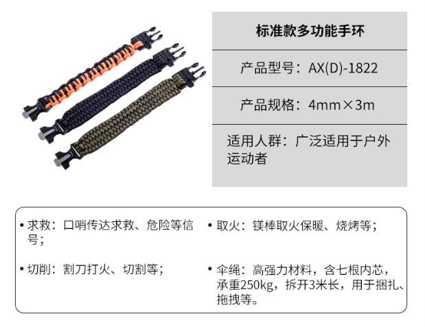 傘繩:高強力材料,包含七根內(nèi)芯,承重250kg,拆開3米長,用于捆扎、拖拽等。