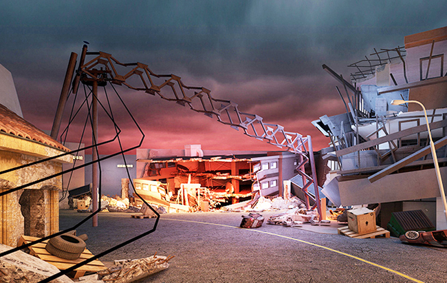 再現(xiàn)地震后,道路變形,有波浪狀也有斷裂上下錯(cuò)層的場(chǎng)景。在道路兩側(cè)有建筑物倒塌,形成通道。體驗(yàn)者從破損的通過穿過,到達(dá)一個(gè)相對(duì)安全的位置。在臨近出口處,設(shè)置一條斷掉的高壓電線掉落在地上,要求體驗(yàn)者此處應(yīng)該采取單腳跳的方式離開此區(qū)域。